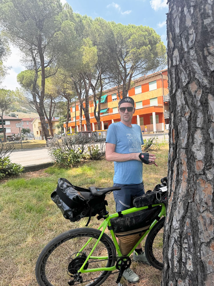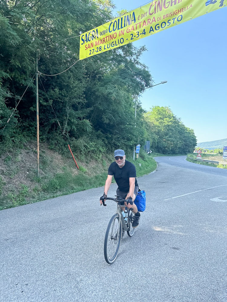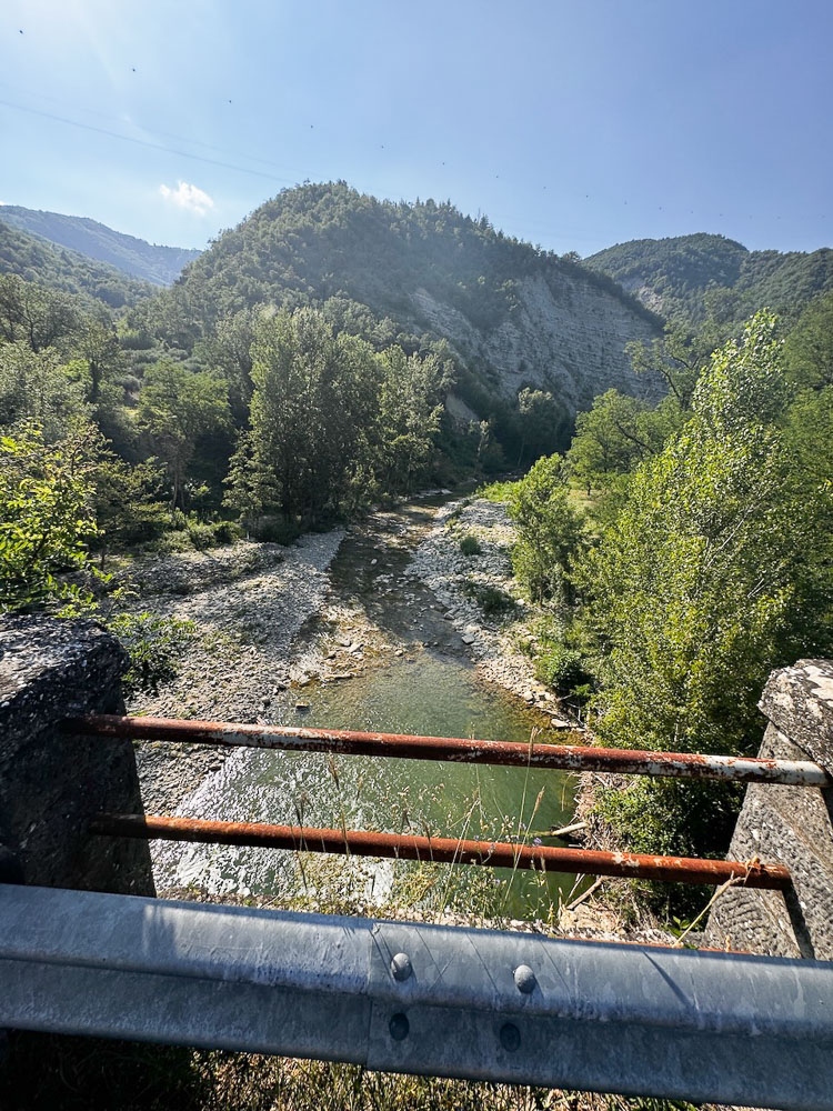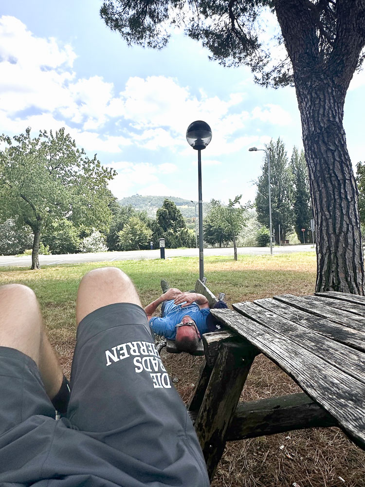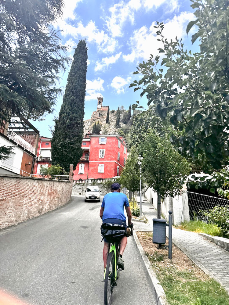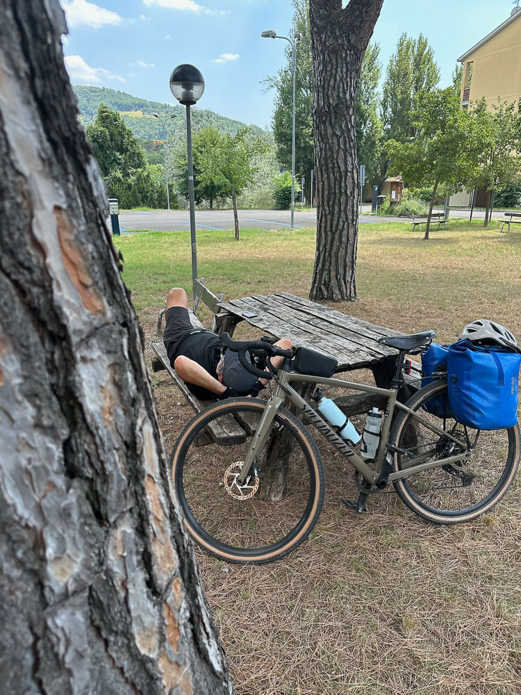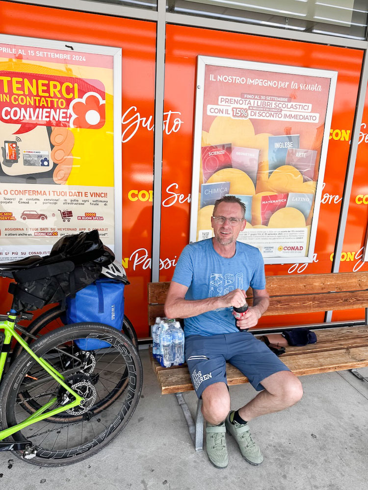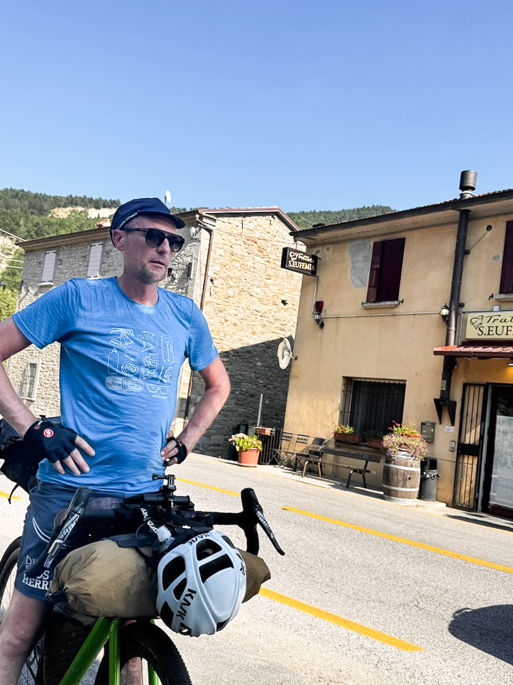 Mittlerweile hat es 36° und ein Italiener hat uns gefragt, ob wir einen Sonnenstich haben, weil wir bei diesen Temperaturen mit dem Rad unterwegs sind. Das haben wir uns übrigens auch gefragt und haben im Schatten eines Supermercato Schutz gesucht und eine eiskalte Cola gezischt. In einem nahen Park haben wir unsere Siesta abgehalten und in einer netten Bar gleich unterhalb des Castello von Brisighella, haben wir unsere Energienlager aufgefüllt, bevor‘s zur Endstation Morradi ging.