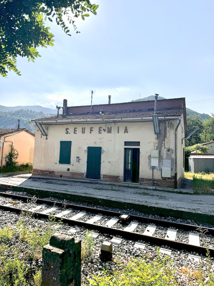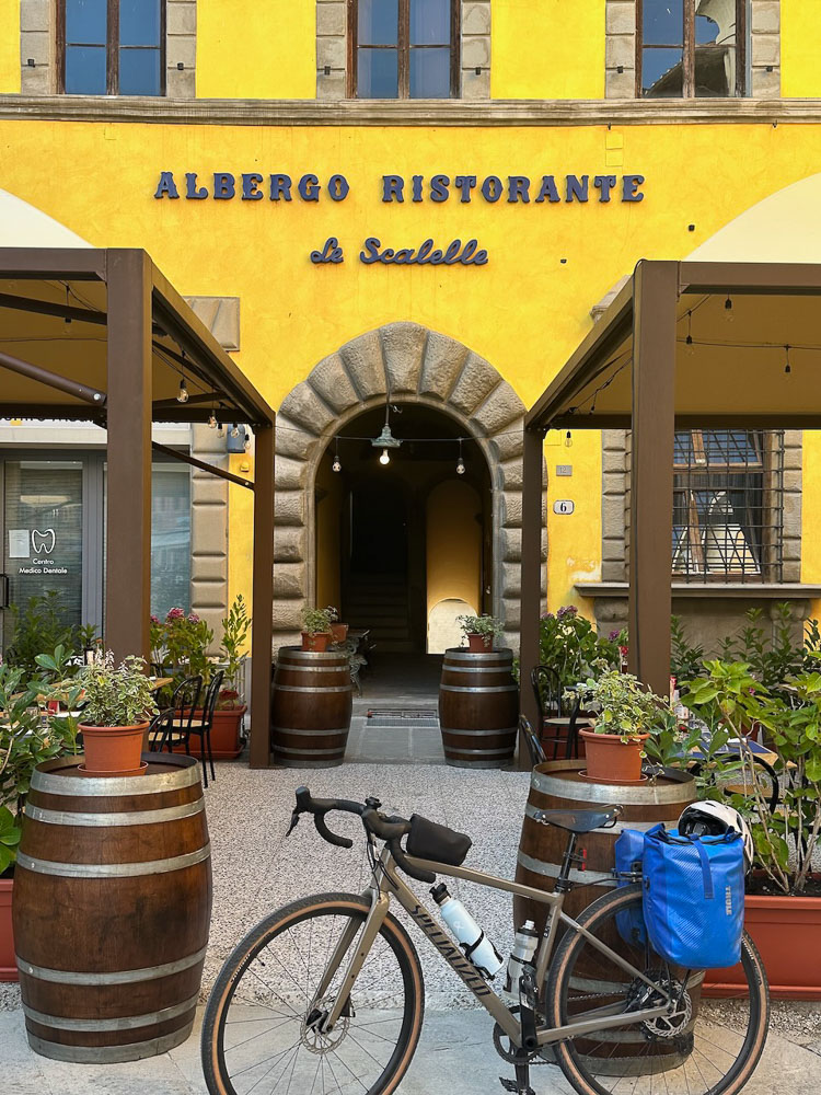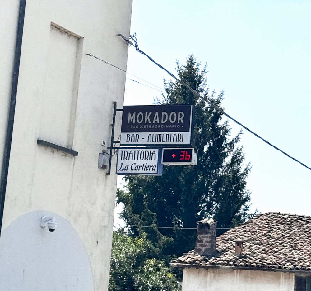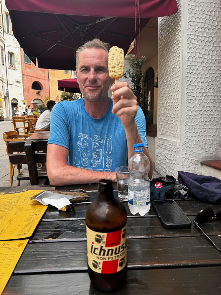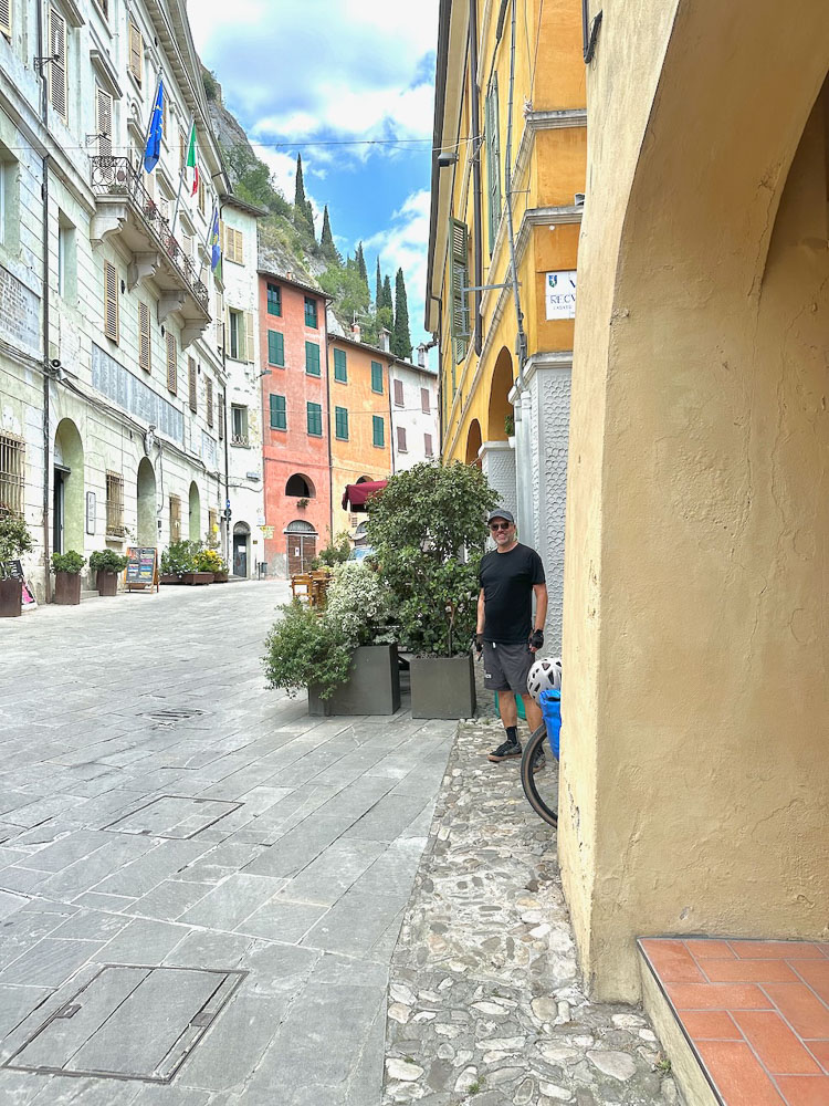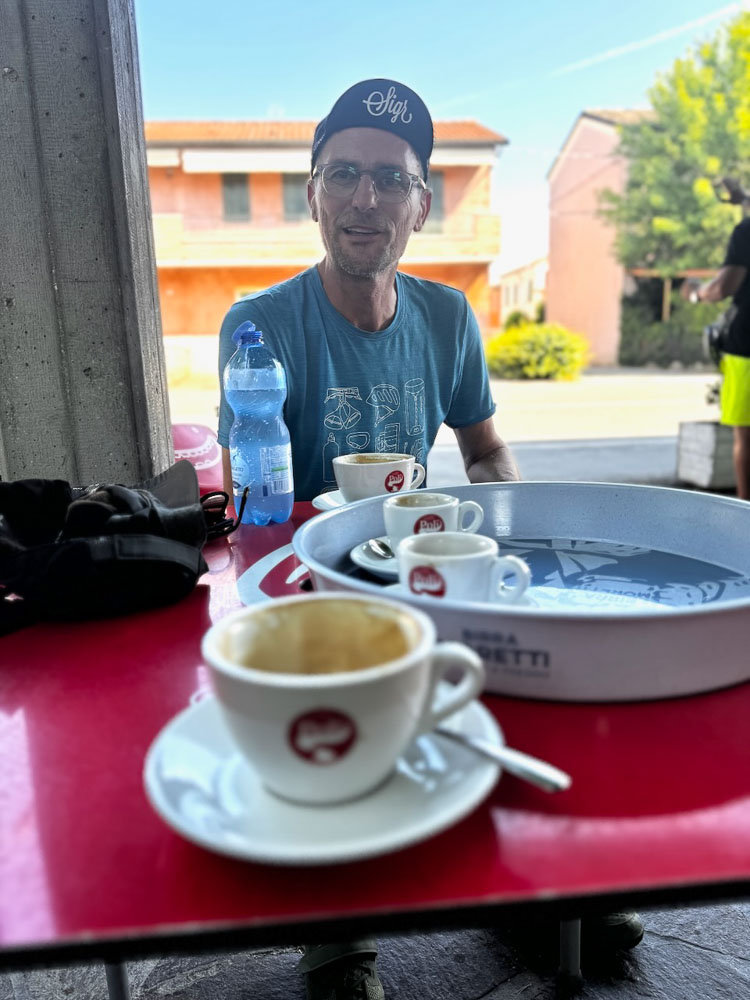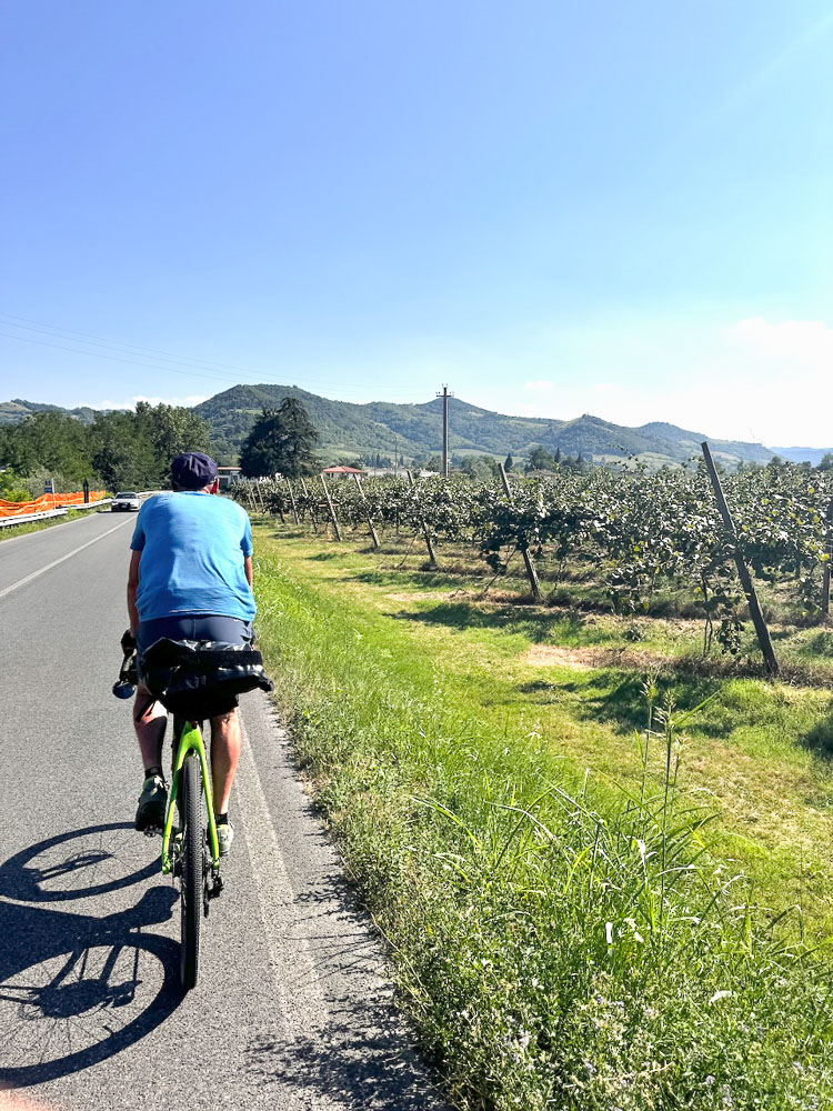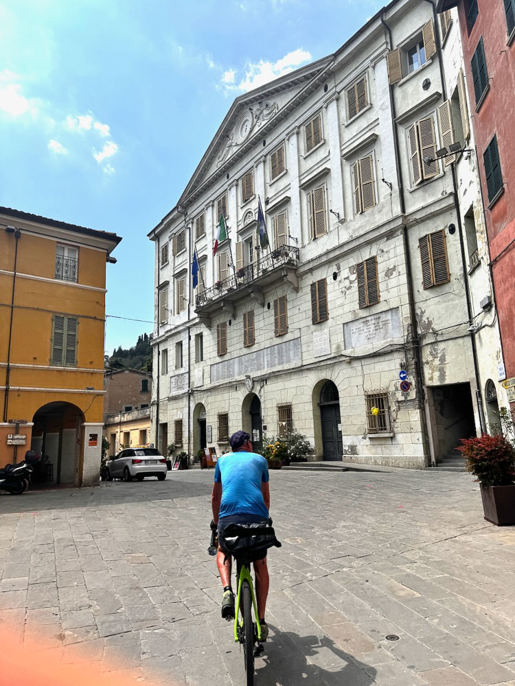 Mittlerweile hat es 36° und ein Italiener hat uns gefragt, ob wir einen Sonnenstich haben, weil wir bei diesen Temperaturen mit dem Rad unterwegs sind. Das haben wir uns übrigens auch gefragt und haben im Schatten eines Supermercato Schutz gesucht und eine eiskalte Cola gezischt. In einem nahen Park haben wir unsere Siesta abgehalten und in einer netten Bar gleich unterhalb des Castello von Brisighella, haben wir unsere Energienlager aufgefüllt, bevor‘s zur Endstation Morradi ging.