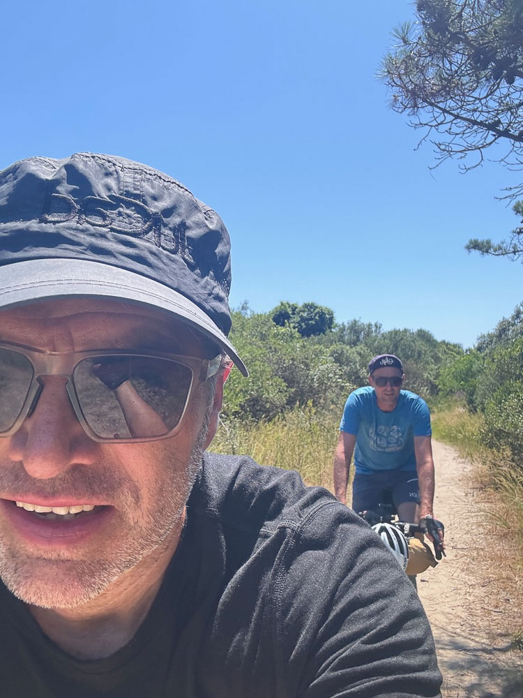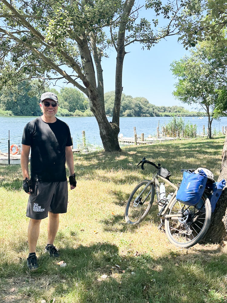 Unsere Bikes, Wadln und Hintern freut‘s. Fahren wegen der Hitz‘ ohne Radler-U-Hos’n. Man g‘wöhnt sich an alles.