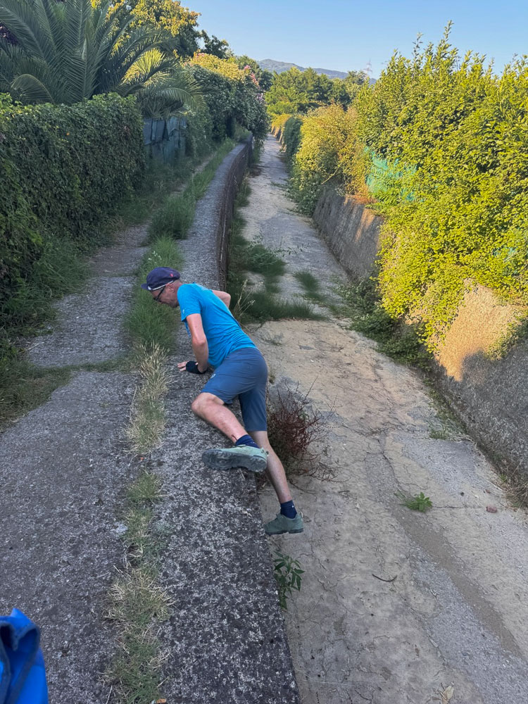 Zu guter Letzt sind wir in einen mannshohen Schwemmkanal geklettert und entlang geradelt, weil Komoot hier die Route eingezeichnet hat. Na guat… Räder owiheben und später wieder auffi. Das raufklettern von Stoni schaut nicht ganz so elegant aus… Wenn man aber bedenkt, dass der Typ diesen Winter in Oberschenkelhalsbruch hatte, springt er rauf wie eine Gazelle. Net schlecht!
